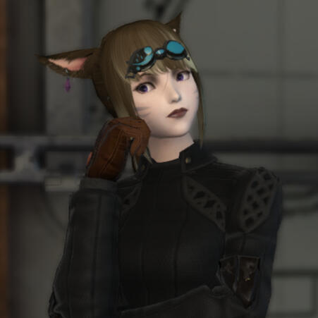 Standing at an average of 5' 5" the Miqo'te strikes a rather normal figure at first glance. She often keeps her brown locks in a ponytail with streaks of blonde contrasting throughout. Sharp purple eyes pierce from her face tracking and noting every little detail of those around her as her lips purse into a tight neutral pose. Scar and marks litter her body as proof of her profession and hard life but in no way mar the beauty beneath. The worst of the marks is along her back in deep furrows of tissue that create a crosswork of healing scars. Naturally she carries an athletic and toned form from years of training and work, ever diligent to keep herself in top form, however this has not robbed her of her womanly figure, soft curves marking her bust and rear. A fluffy brown tail ever swishes pensively behind her as if feeling the very air itself.